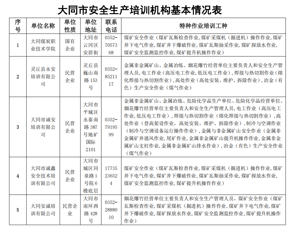 大同市从事特种作业人员安全培训机构及培训工种基本情况