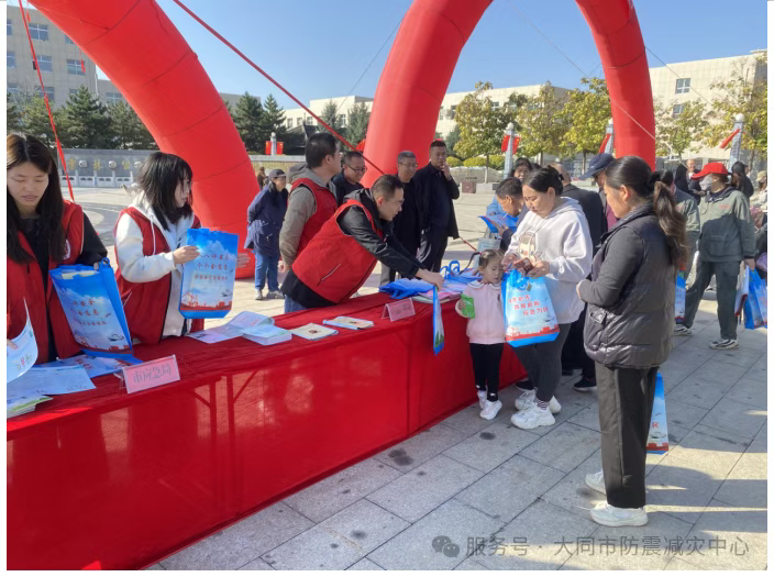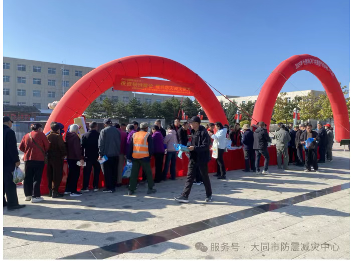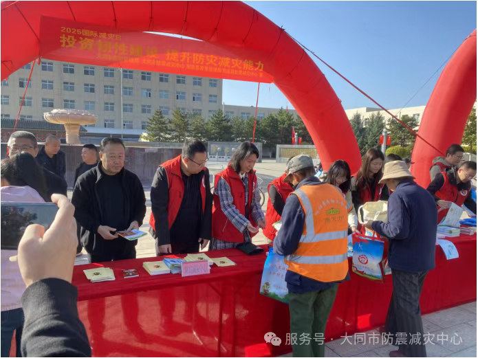 为了深入学习贯彻落实习近平总书记关于防灾减灾救灾重要论述精神,大力普及避险、防护、自救、互救等应急知识,提升基层灾害预防和防灾减灾救灾能力,科学有效应对灾害,弘扬抗震救灾精神。值2025年10月13日第36个国际减灾日及“大—阳地震”36周年这一重要时间节点,2025年10月14日,大同市应急管理局、大同市防震减灾中心联合阳高县应急管理局、阳高县防震减灾中心及阳高县抗震救灾指挥部成员单位在阳高县云林广场开展主题为“投资韧性建设,提升防灾减灾能力”的宣传活动。