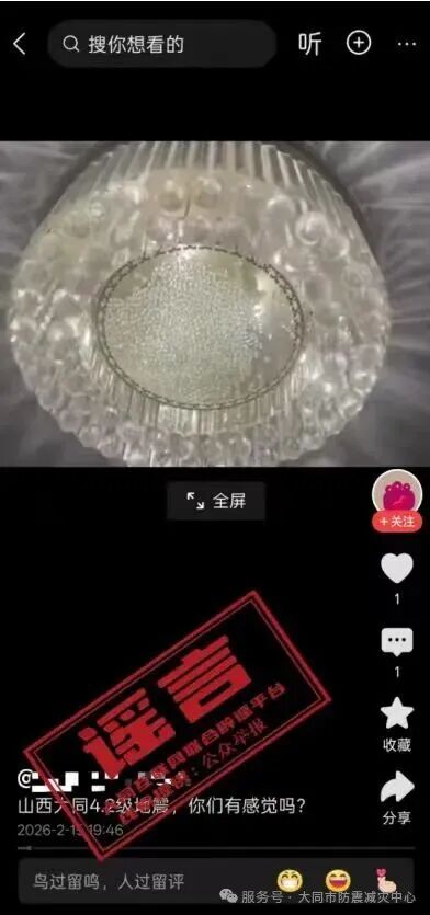 辟谣公告:“山西大同发生4.2级地震,你们有感觉吗”系谣言